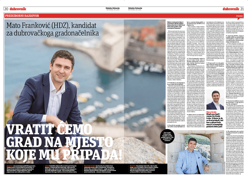 Kandidat Hrvatske demokratske zajednice za dubrovačkog gradonačelnika, Mato Franković za Slobodnu Dalmaciju: “Vratit ćemo Grad na mjesto koje mu pripada!” Cijeli predizborni razgovor pročitajte OVDJE!